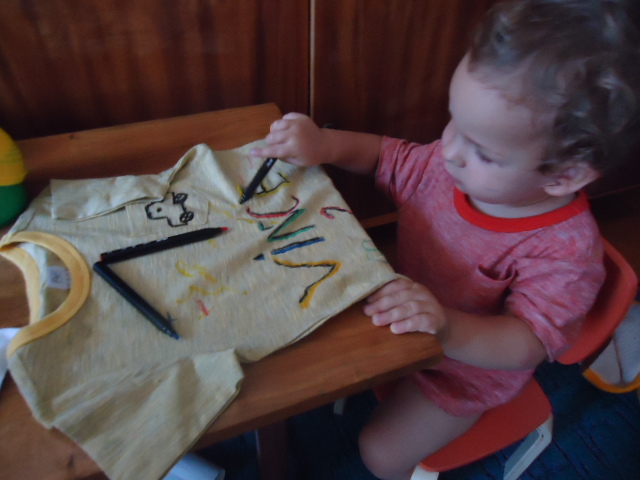 Vincinek is ráírtam a nevét, rajzoltam neki macskát, halat a hátoldalára és autót az elejére. Utána természetesen ő is szabadon alkothatott.